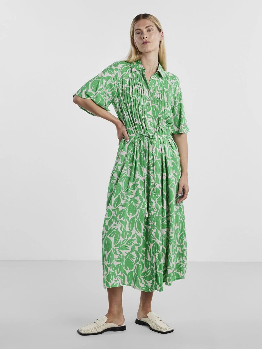 – Stof met contrasterend patroon bij de kraag en de knoopsluiting